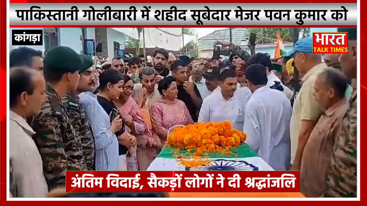 जम्मू-कश्मीर के राजौरी में पाकिस्तानी गोलीबारी में शहीद हुए हिमाचल के सूबेदार मेजर पवन कुमार को रविवार को पूरे राजकीय सम्मान के साथ अंतिम विदाई दी गई। कांगड़ा जिले के सिहालपुरी गांव में उनके पार्थिव शरीर का अंतिम संस्कार किया गया, जहां बेटे ने उन्हें मुखाग्नि दी।